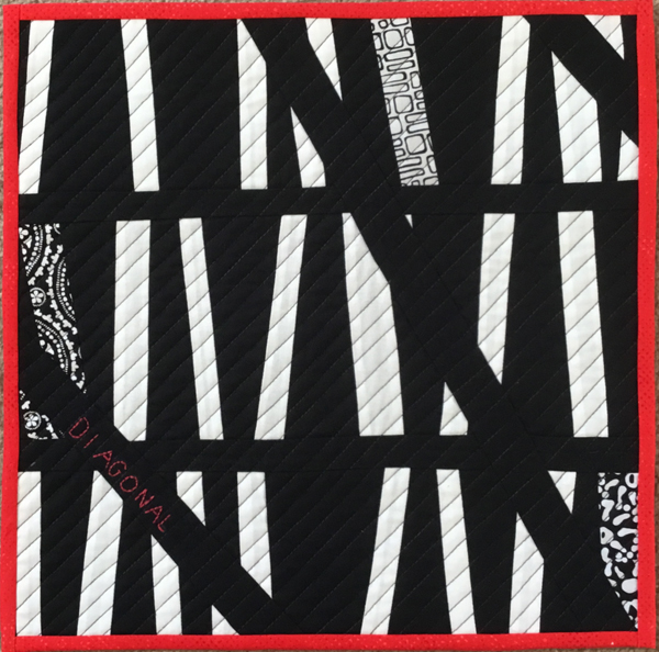 Method. Carrying on with the black and white theme I used black and white white adding sections of black and white fabric used in the previous quilt. After sewing three panels I sliced across the piece in three places to give the quilt a bolder sense of movement. The word “Diagonal” is hand embroidered in the left hand strip. I quilted diagonally across the quilt with a black thread.