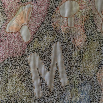 Method. The letter M and mushrooms where outlined on the fabric. The mushrooms where then outlined with a larger mushroom shape. Then I proceeded to hand stitch with stab stitch around around the larger mushroom shape in one colour. The colours in-between the mushroom was random. The quilt was then bound with a grey fabric.