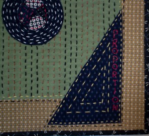 The technique of this quilt is similar to the Letter S quilt where I borrowed from the Japanese technique of Boro and Sashiko stitching. The elements of the design are circles and triangles, with a smaller square within the size of the quilt. The word “Proportion” was hand stitched along the long edge of the large triangle. I used fabric from the first quilt and added new colours in this quilt. I machine quilted around the outside edges of the quilt.
