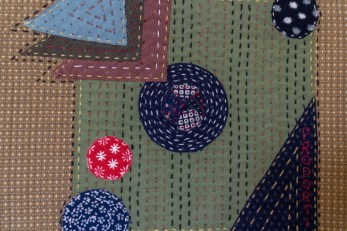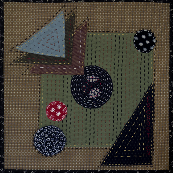 A different interpretation which shows off your mastery of hand stitching in the Japanese tradition. The different sized elements illustrate proportion well, and they work as a whole. The splashes of bright colors, such as the red, enhance the overall effect and add interest.