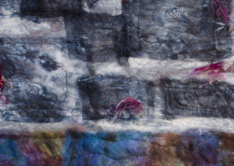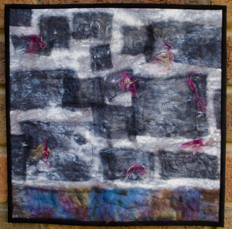 When this challenge was announced I thought of storm clouds. My original design was sketched out and patterns made, but somehow the choice of fabrics was not suitable. I then made the decision to use hand dyed silk for my background and hand dyed silk organza for the clouds and ocean. I did not want to cover the entire sky area with the black organza, so decided to cut irregular rectangles. I first diagonally quilted the background silk, then when the “clouds” were in place, I free motioned a simple design. The ocean is several layers of silk organza and tulle, to give the impression of a turbulent ocean I did a simple wavy free motion quilting stitch across the piece. To add some touches of colour, I hand sewed torn scraps of a open weave silk fabric. While the quilt is abstract I think it conveys the impression of dark clouds gathering over the ocean.