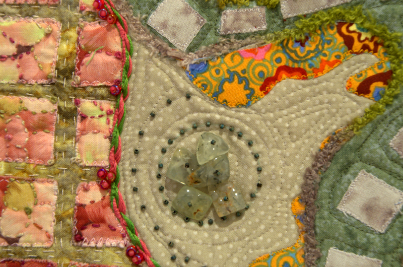 The Zen Garden was embellished with gem stones and glass beads. I also used  hand embroidery and beads to embellish the different flower beds and trees. I faced the quilt rather than adding a binding.