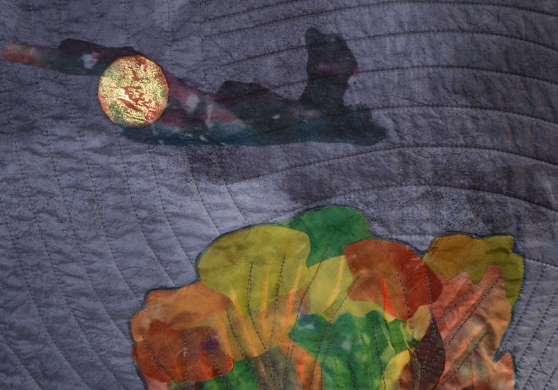 The overdyed background is a wonderful way to portray something such as pollution that cannot be readily seen. Your technique for the tree does show a less bright fall than one thinks of. The background quilting really provides movement and is reminiscent of fall winds blowing around swirling leaves.
