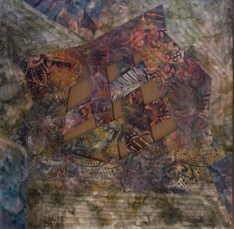 I suspect that the colours on my computer screen are not doing justice to this piece (things tend to look darker than they are on it.) The use of woven tubes to fill space is very interesting. You have taken the opportunity to explore different techniques in the series, while letting all of the pieces reflect geometry. Your choice of batiks is lovely.