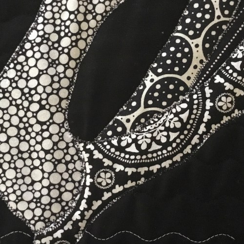 Living next to the Southern Ocean and the River Murray, it is easy to take the ocean and it’s inhabitants as inspiration for my quilt. One beach I go to has a million+ shells, so I picked one and used it as my design. I sketched out the shape of the shell on paper, divided the shell into sections and made freezer paper templates. By placing the shell at an angle I had hoped to give it a different perspective, having worked with a shell design in the distant past I wanted to add a shadow but did not have the “right” fabric, so instead used white in my quilting design.