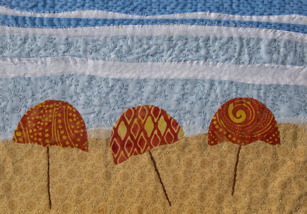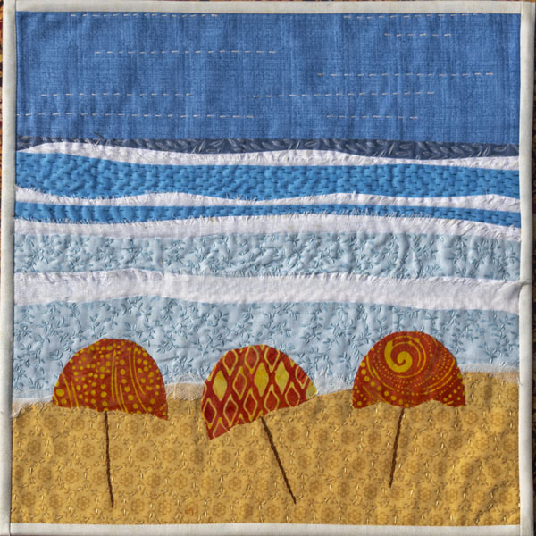 I chose to design a beach scene and used blue printed fabrics for the sea, white fabric with cheese cloth for the waves and a sandy print colour for the beach. The sky is textured blue fabric. To make the design different I added three orange umbrellas. The quilt is hand quilted and bound with an off white texture fabric.