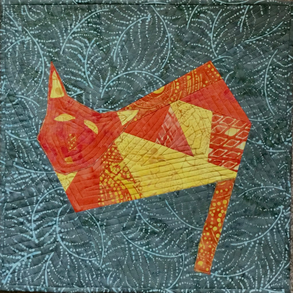 I like your cubist cat and the way he is sitting comfortably on the background fabric (just like a cat would). The colours and stitching are perfect. Well done