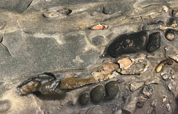 Inspiration – The rocks at Middleton Beach are interesting because of their geological formation and consequence weathering. On the rock faces can be found protruding rocks smoothed by the action of the water, seashells and other bits and bits and pieces caught in the cervices.