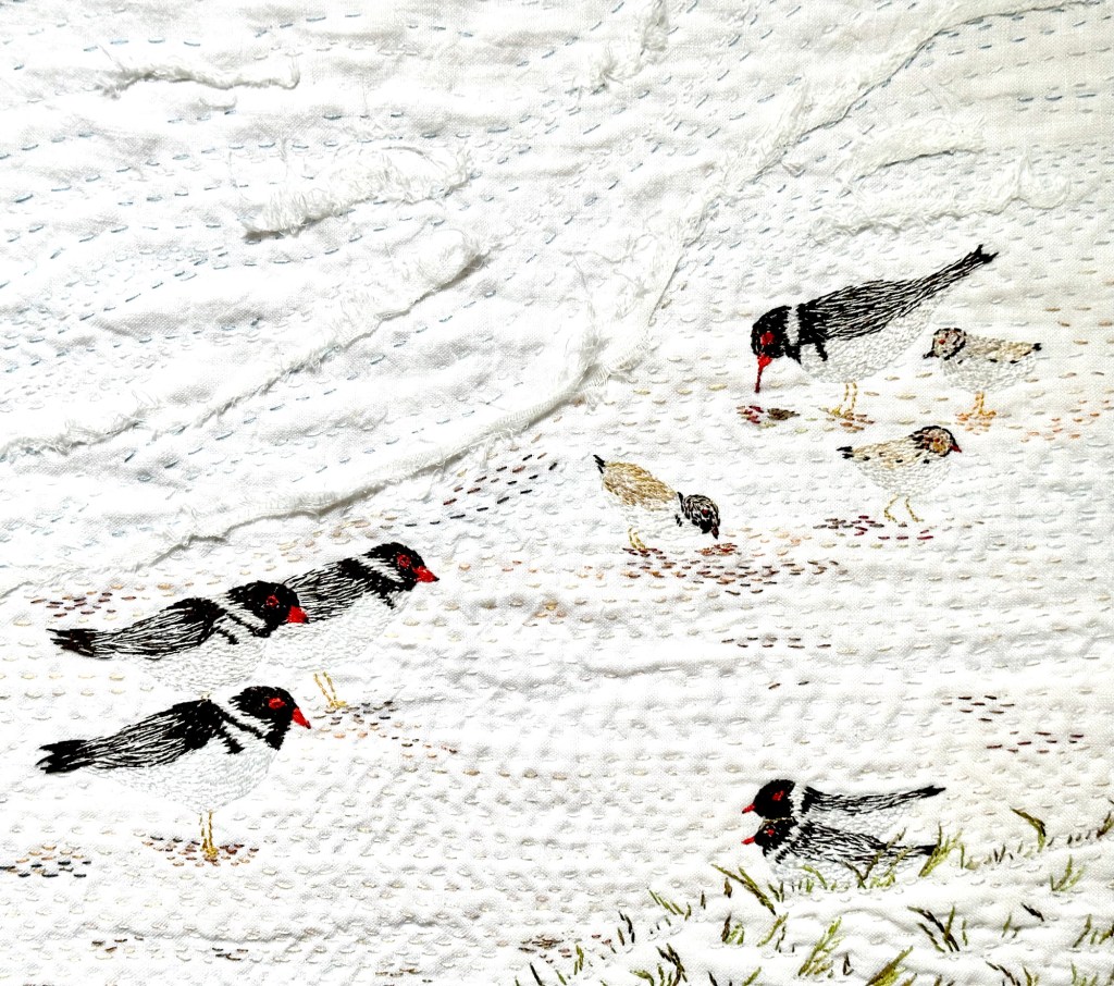 Your hooded plovers are an absolute delight (bird lover talking here). Never seen them before! So cleverly stitched! The sea and sand done in such a minimalistic way. Love the use of cheesecloth, always very effective. Great piece!
