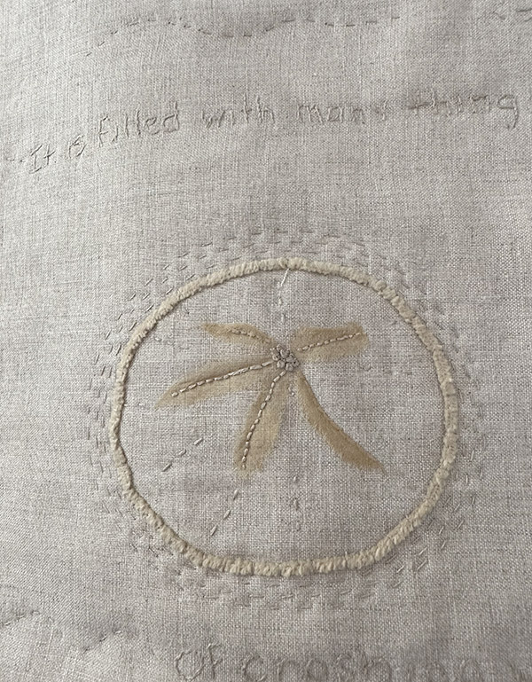 The inspiration for Nature #6 is the numerous shells that I find at the beach. I used a poem to compliment the shells – “A seashell is never empty, It is filled with many things, holds the sounds sounds, Of crashing waves that mermaids sing” author unknown. The materials are a linen cotton background with hand dyed organza and the shells are outlined with chenille yarn, hand embroidered with embroidery cotton.