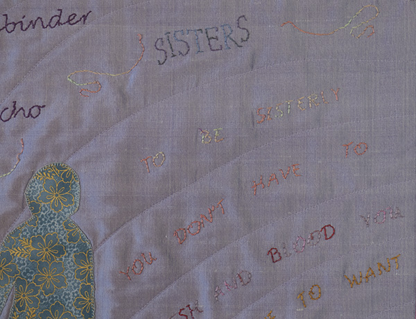 I have again used silk from my sister’s dress making days, appliqued the sister’s silhouette using cotton fabric and hand stitched the definition of “Sisters” -“You don’t have to be flesh and blood to be sisterly, you just have to want good for each other.”