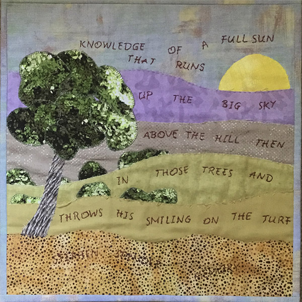 The sunlight on the trees and foliage is very clever, and in fact the fabrics and colours throughout are very well chosen. I like the way that you have included the words to reflect the rolling scenery. Well done