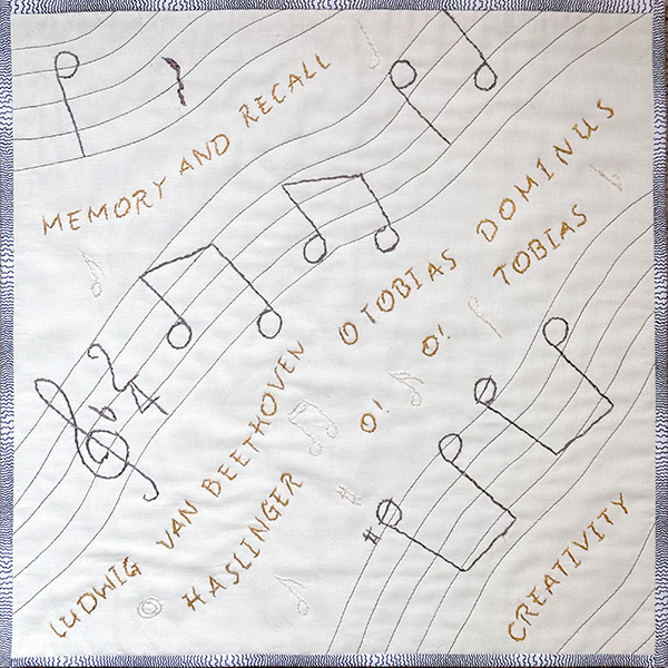 Very interesting to me as I hadn’t heard of this canon before. To have chosen to stitch part of the score of course perfectly illustrates the musical piece. Beautiful stitching, very harmonious piece!