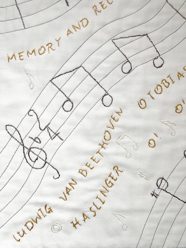 I machined stitched the five bars of a staff in three positions on off-white cotton and hand embroidered some of the music score.