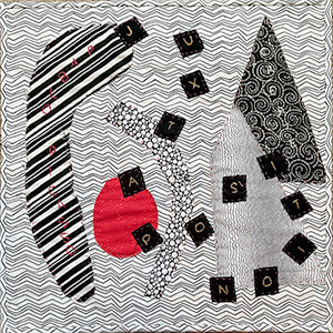 9. I love this piece with black and white fabrics and just one red shape. So nice how you placed the word “justaposition”.