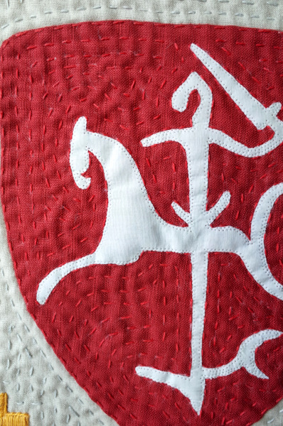 As my knight doesn’t wear a shield, I embroidered the double cross in the lower left corner, as well I embroidered Columns of Gediminas on the right lower corner.