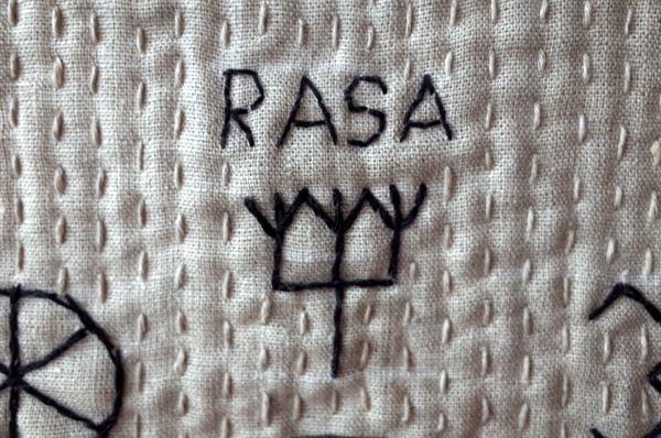 As in my other quilts, I used unbleached and eco dyed linen fabrics with no machine sewing (except the binding). Hand embroidery and hand stitching is done with linen yarn only.