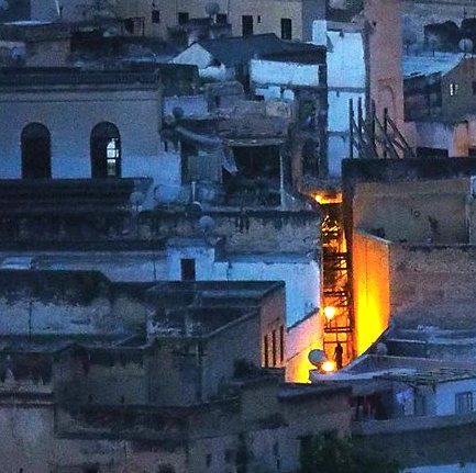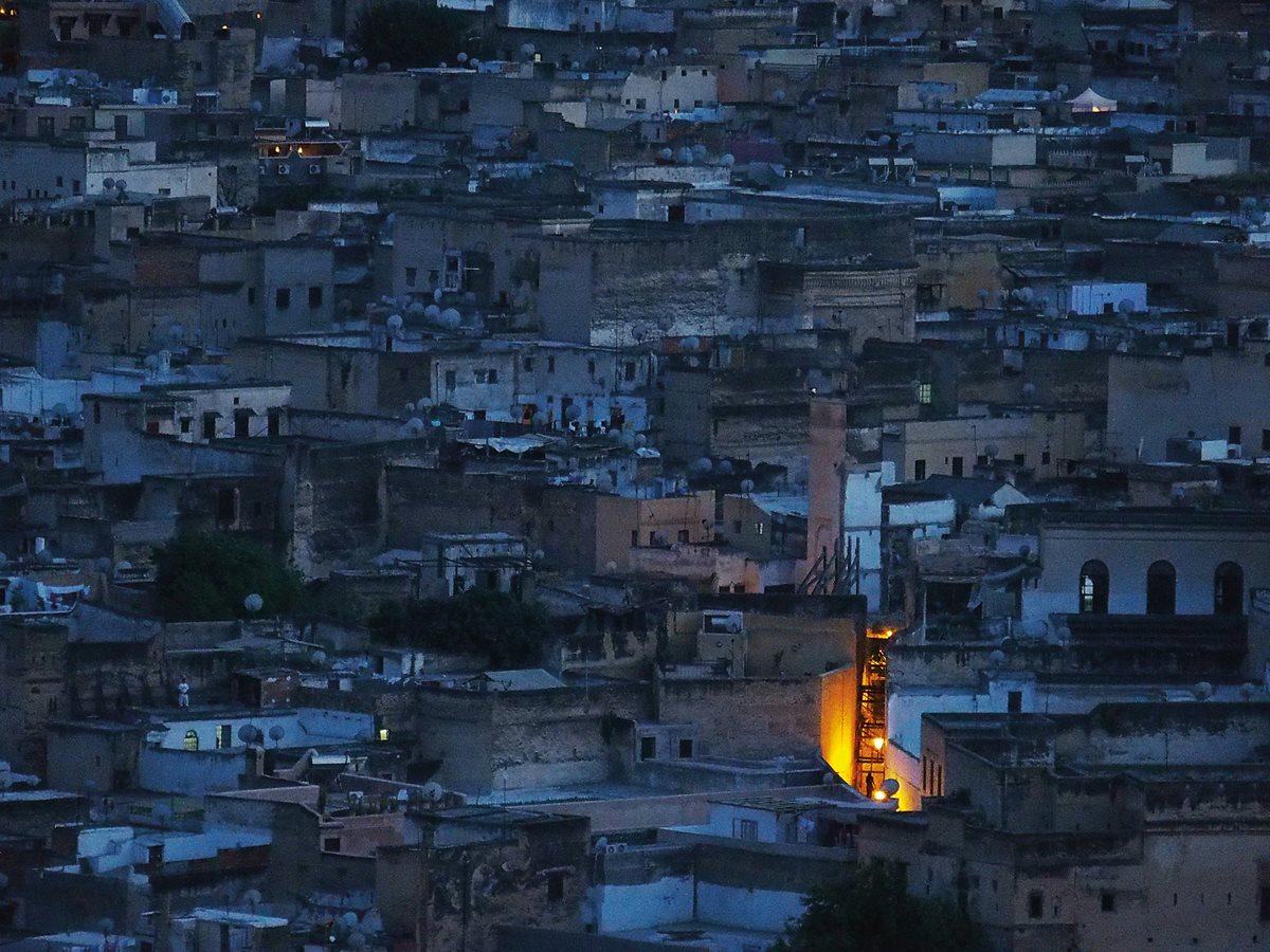 In this photo walls, windows, doors and satellite dishes tessellate at twilight into a patchwork pattern in the madinah, or walled old city, of Fez, Morocco, as a pedestrian passes into view along one of the city’s typically narrow stone streets.