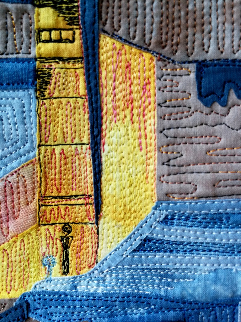 13. Wow! You captured the feel of the quiet, sleepy city with a dramatic contrast of light emerging from the darkness. Skillful use of color and stitching. Well done!