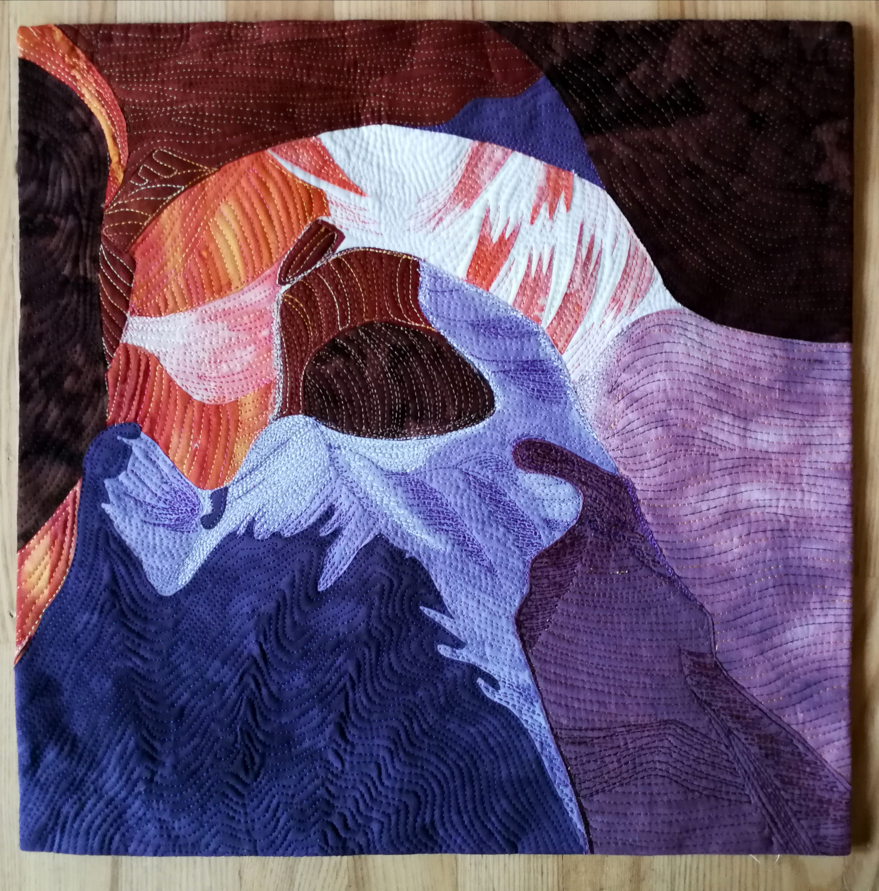 It was very challenging to make decisions on how to reflect on the light that fills this photo. I used my own hand dyed and some commercial fabrics. All pieces are fused using Wonder Under. Machine quilted and hand stitched.