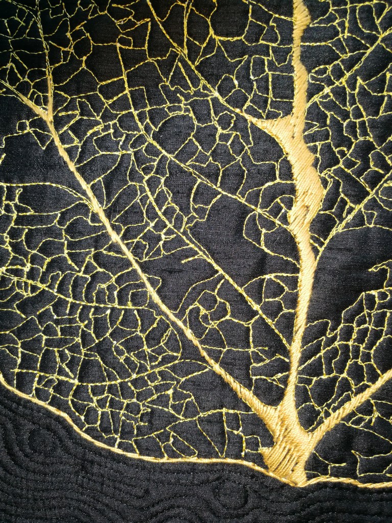 The skeleton is machine embroidered on the piece of black Dupioni silk. I hand stitched it to highlight the edges and some stems of the leaf. The black background then was machine quilted.