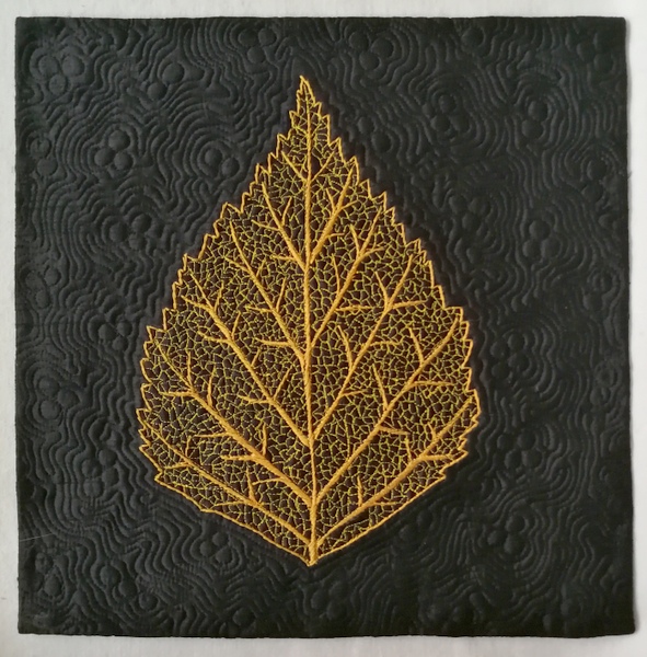I am in awe of your stitching. The simple design of gold outline on the black background is really effective to showcase the leaf structure. Beautifully done