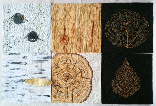 I already studdied the barks and the wood grains and now I am looking into the leaves. As I already have the skeleton of aspen tree, here comes the skeleton of birch tree.The skeleton is machine embroidered on the piece of black Dupioni silk. I hand stitched it to highlight the edges and some stems of the leaf. The black background then was machine quilted.