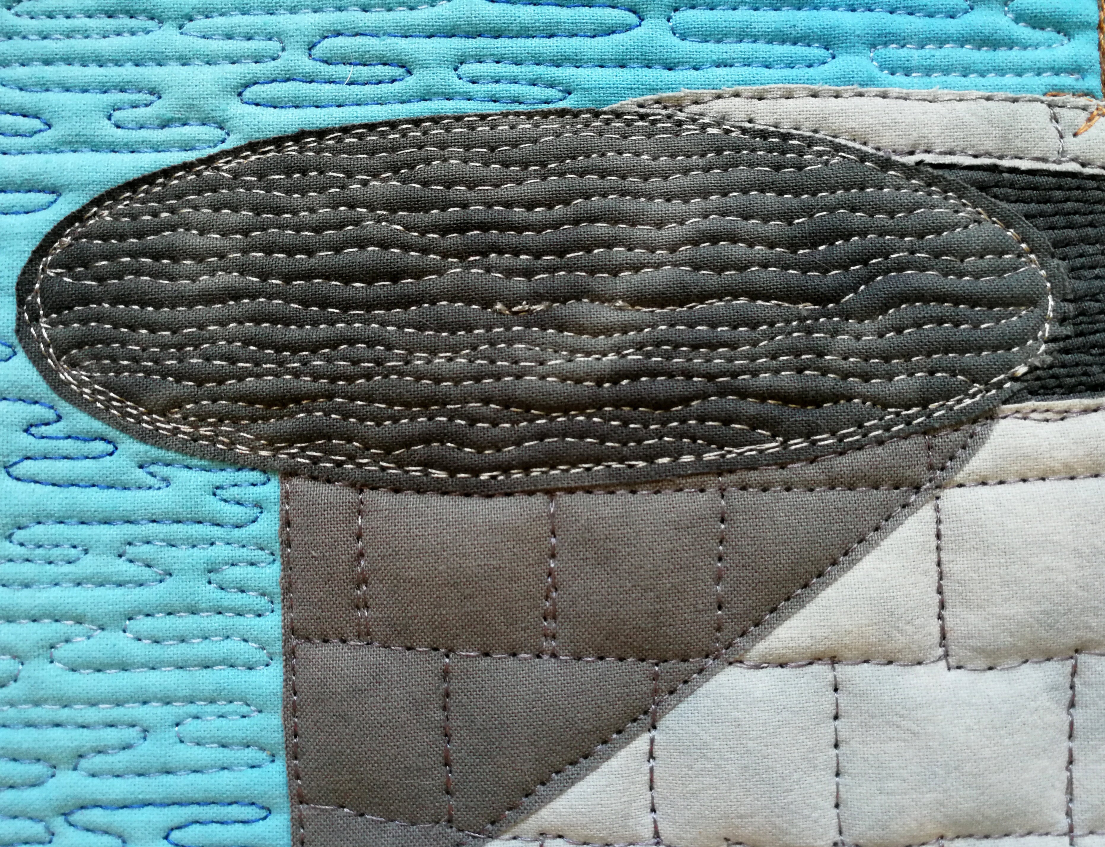 10. Love all the bright colors and appliqué designs, it gives the quilt the feel of a children’s book. I also admire the way you stitched the title and densely stitched around it giving the piece depth and texture. Well done.