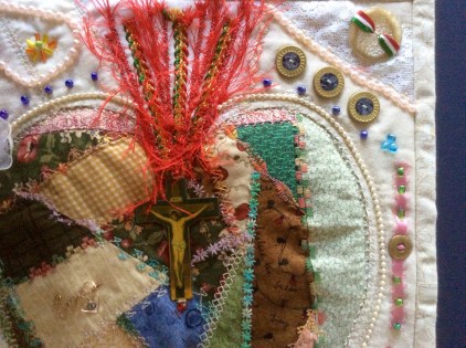 I first pieced all the light fabrics, then the colored fabrics. With the Gutermann thread I used the decorative stitches on my Janome sewing machine on all the seams of the heart fabric. I then did reverse appliqué. I placed wool batting under the heart to give it a fuller, trapunto look. I embellished it with bits and pieces of laces, ribbons, yarns, beads, pearls, vintage buttons, a scapular from one of my children and some jewelry pieces that my dad had given me.