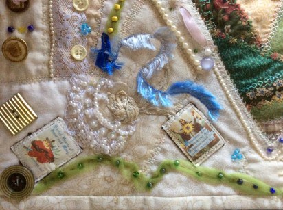 This is a very gentle quilt and a great contrast to your first piece. I like your crazy patchwork and the many little embellishments.