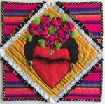 Once I created my new fabric I began cutting strips into a type of ray or desdén shape. This became my background. I continued this technique with the red fabric to create the heart. I embellished the seams of the heart with different stitches, cut the flames on a batik piece of fabric and appliquéd both the flames and the heart. For the thorns I used an old, thick shoelace and couched it down. I then embellished it with a few red beads symbolizing drops of blood, added the eyelash yarn and finished it with a cross from my broken rosary collection and quilted it with simple lines.