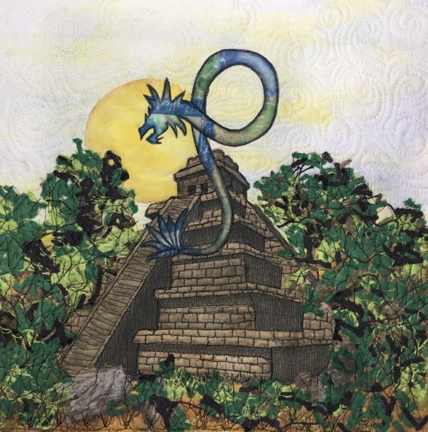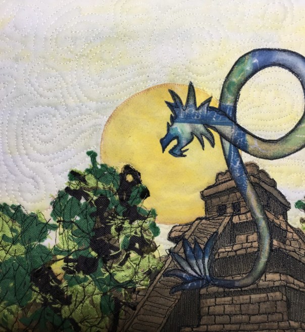 Several great techniques here that make a distinct whole piece. The serpent is particularly good and I love the quilting in the sky.