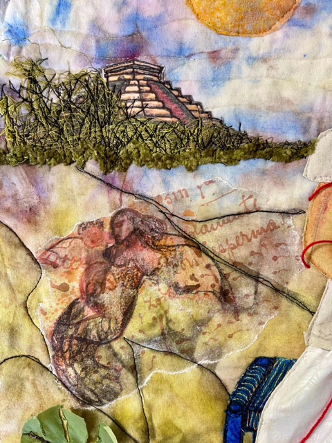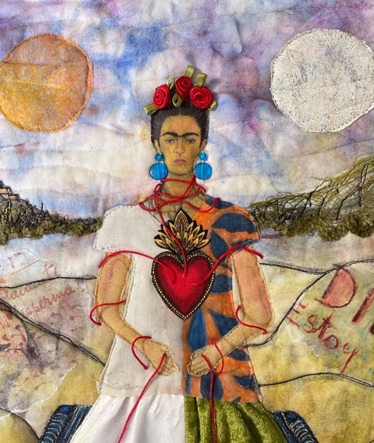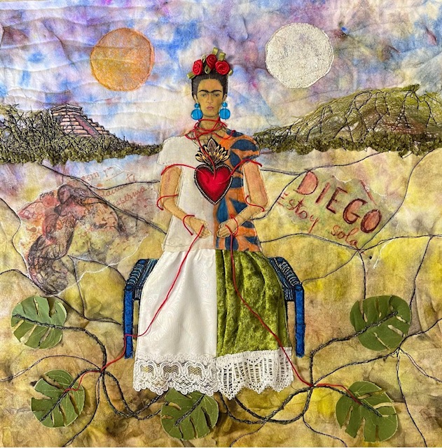 Inspiration: The Two Fridas, 1939 The Two Fridas is a portrait of love, heartbreak and duality after Diego asked for a divorce after 10 years of marriage. I chose to unite both Fridas in my composition. The part of Frida in white represents her European heritage whereas the colorful one is wearing a traditional Tehuana skirt and blouse, representing her Mexican heritage. Her flowing veins connect her to her dual identity, her heritage, her love, her sadness, her loneliness, her suffering to ultimately reconnect with our nurturing mother earth. Materials: hand dyed cotton bed linen, commercial fabrics, photo transfer, journal pages, raw edge appliqués, 3 D skirt, beads, 3 D silk flowers and leaves, acrylic paints, inktense pencils, lace trims, hand dyed jute, hand dyed gauze, indigenous hand dyed Oaxacan yarn, used dryer sheets and red string.