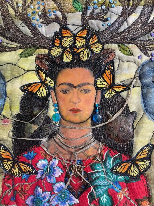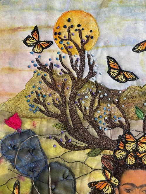 Materials: hand dyed cotton bed linen, commercial fabrics, gauze for the mountains, a used dryer sheet for the moon and sun, blue organza cactus representing Casa Azul, 3 D fringed yard, machine embroidery, free motion quilting, raw edge appliqué and crystal earrings, hand dyed raffia for the roots, photo transfer, acrylic paints, DMC embroidery floss from my mother’s collection for the French knots and cactus thorns.