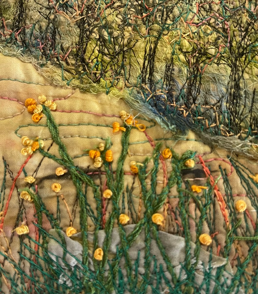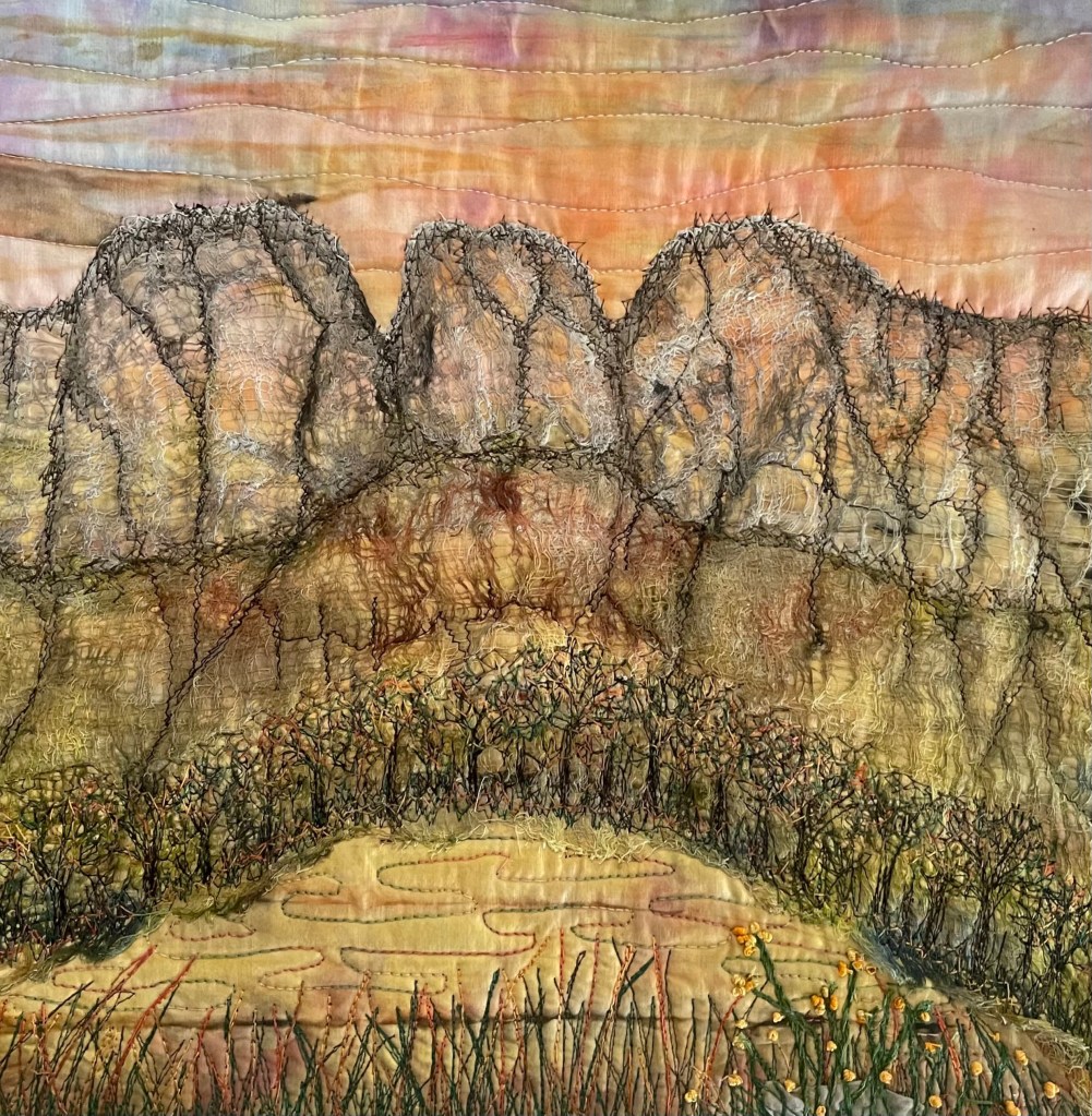 I love the way that you have threads and stitching to bring out the texture of the mountains, and the colour and details of the foreground. the result is beautiful