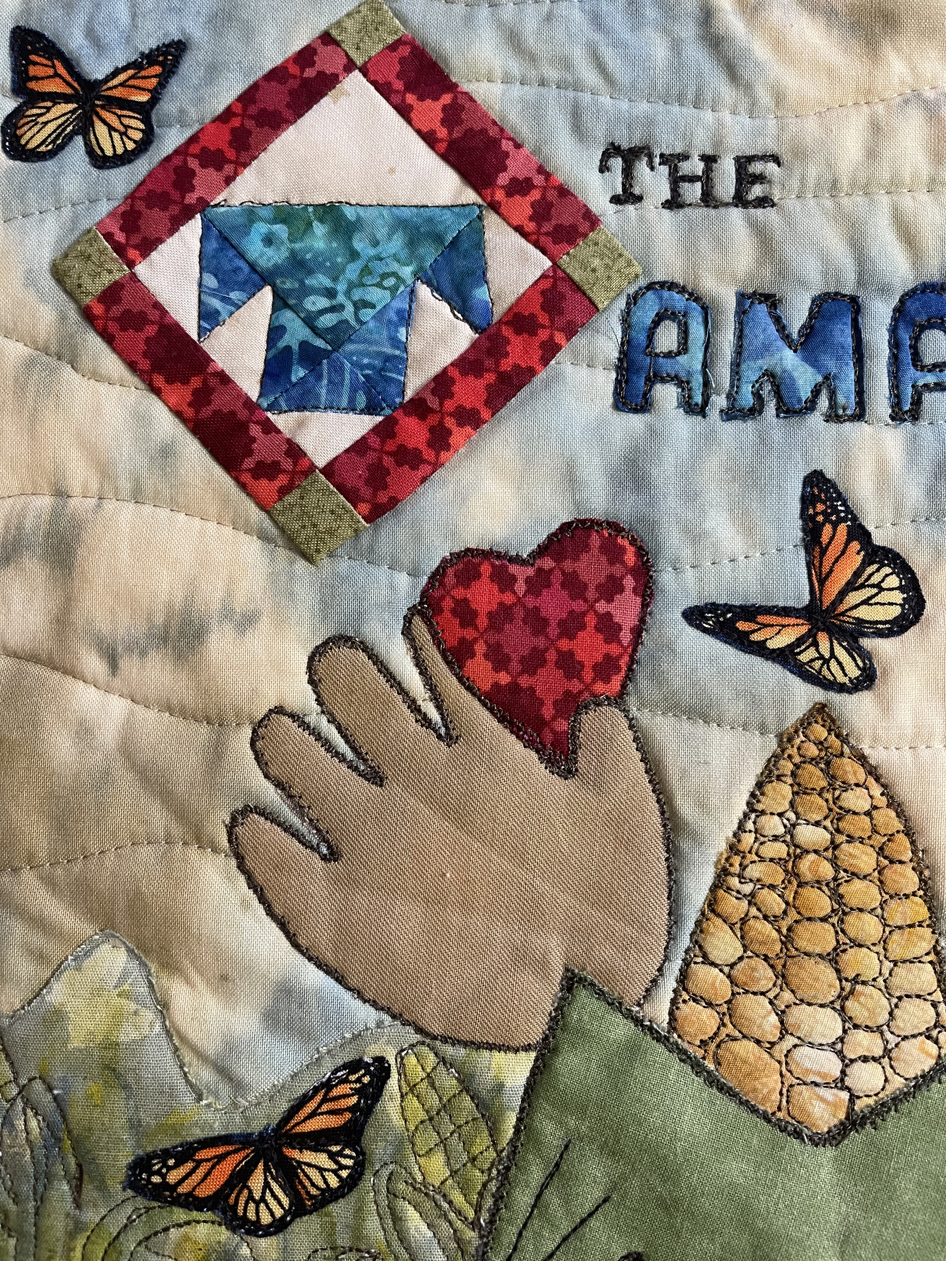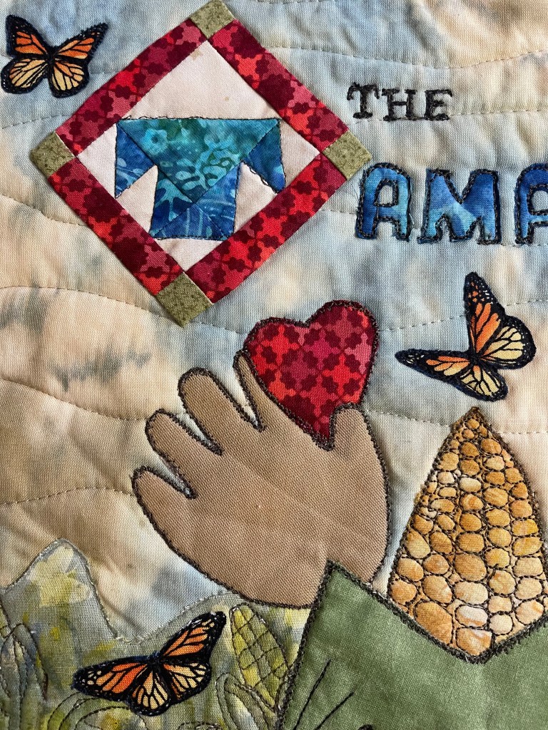 I used commercial fabrics that I over dyed, machine quilted corn stalks simulating fields, and I used dark thread to give the feel of an ink drawing, The butterflies are in memory of my dear friend Jane. I feel so blessed to have called her my friend and sister of color as she affectionately called me. I am forever grateful for the precious time we spent together.