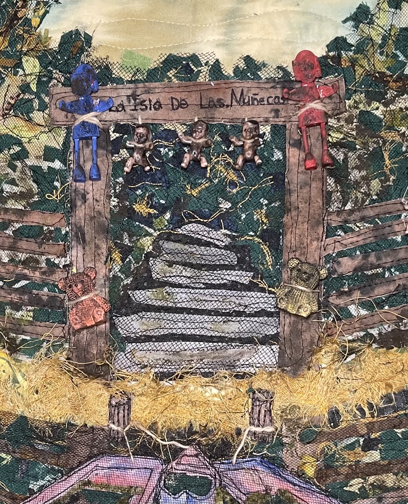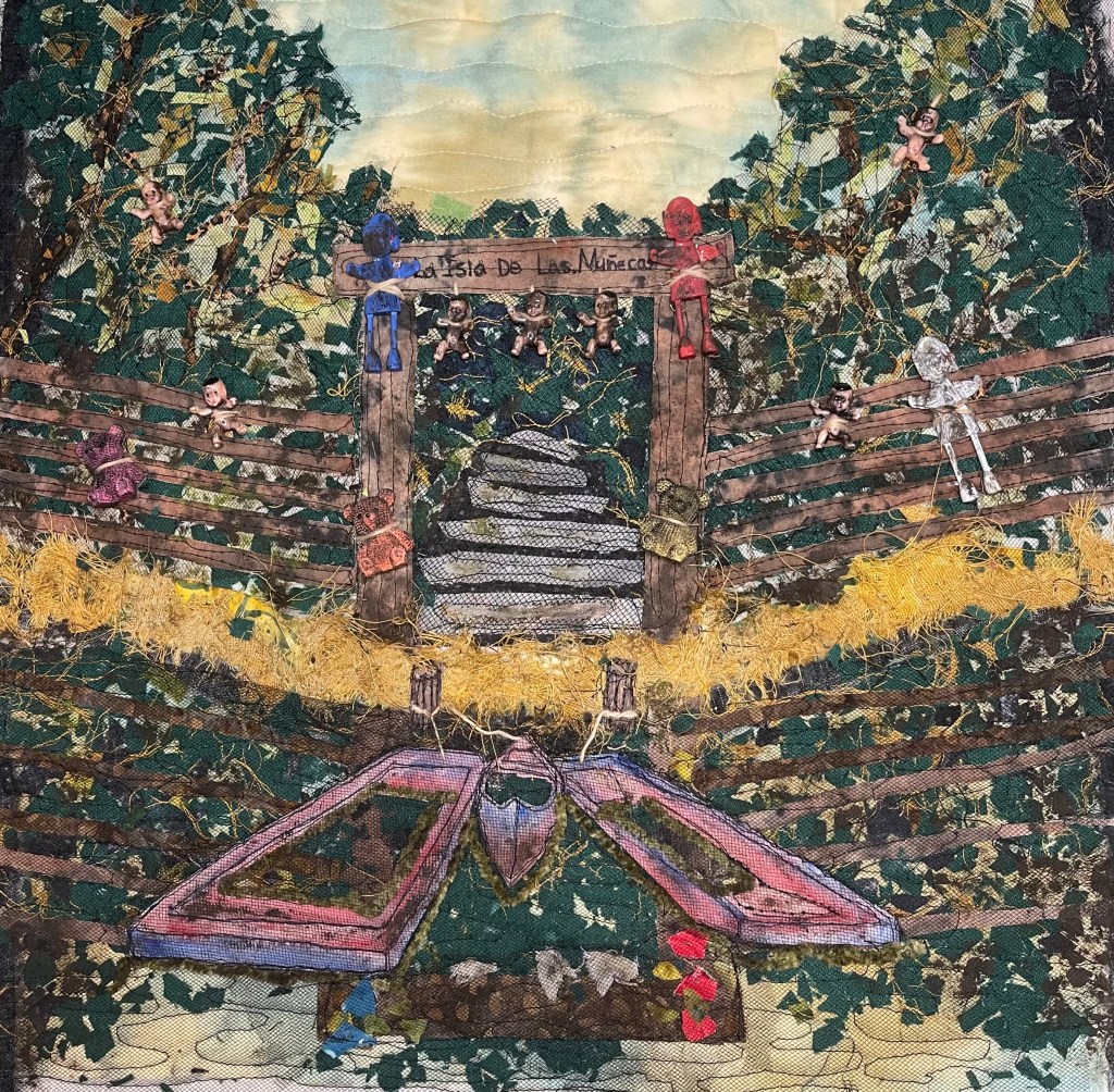 Materiales : vintage fabrics, tulle, oaxacan yarn, wool yarn, confetti technique, free motion quilting, raw edge apliqué, 3D dolls my husband made for me, and found objects.