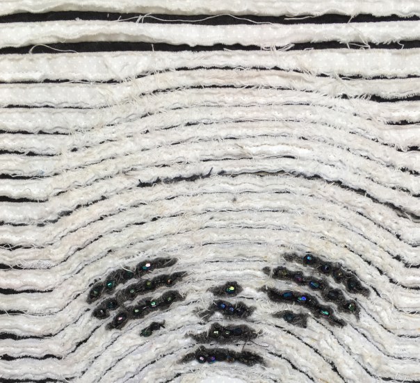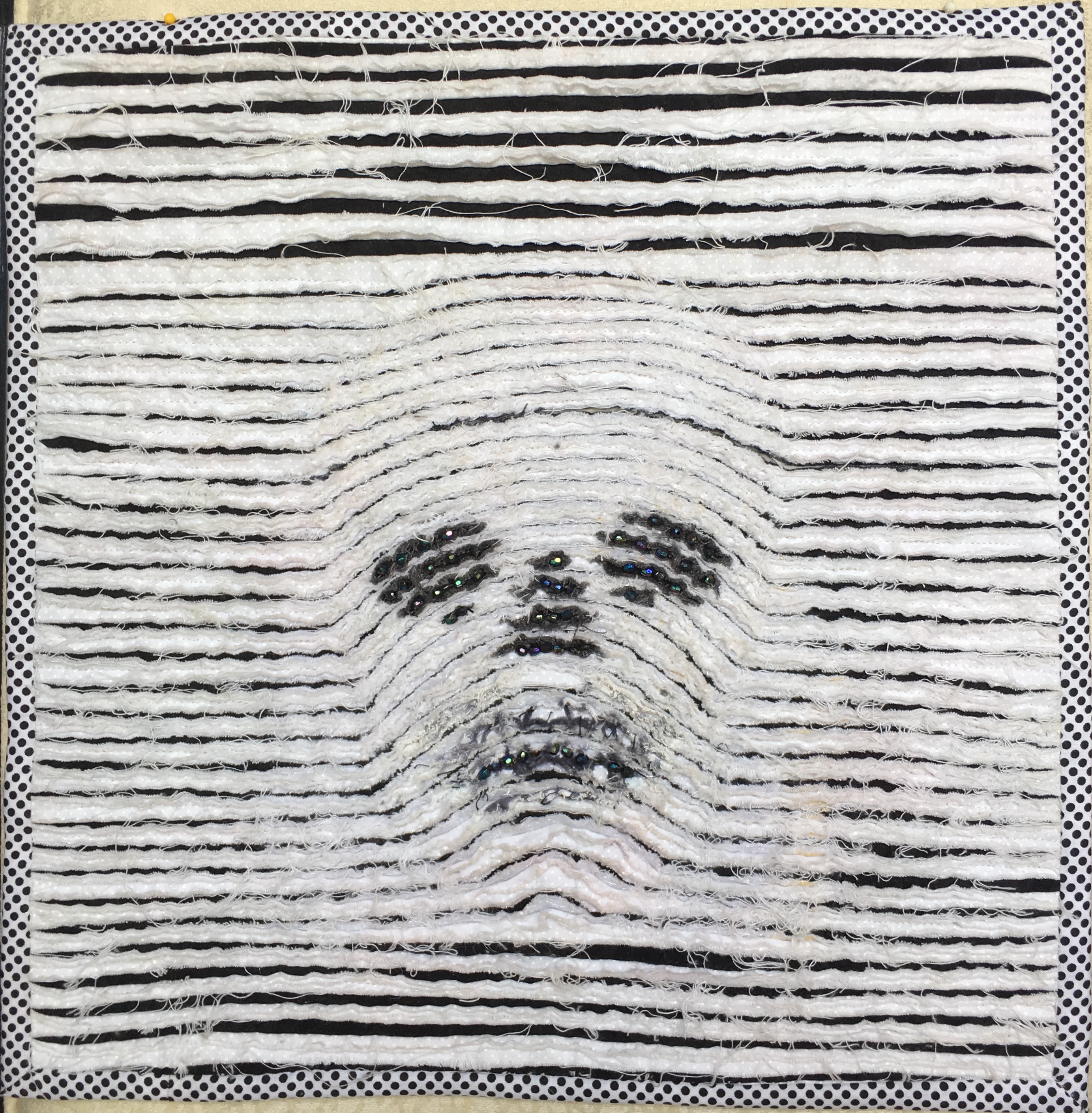 For the Black and White challenge I wanted to see if I could create a dimensional look with the slashing technique. I started with a canvas for support then a layer of black background then added 2 layers of white. I didn’t want it to fuzzy because I wanted to be able to see the black lines. I then raw appliquéd a simple design of the eyes, nose and drew in the mouth with a black sharpie. I sewed straight lines and then curved them to the skull shape to try to create the dimensional look and then I slashed it. I washed and dried it and finished it with a black and white polka dotted binding. I embellished it with the black beads that I saved from my daughters old sandals and added them around the eyes, nose and mouth. I discovered that the less detail you put in is better for this technique.