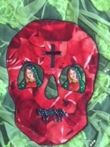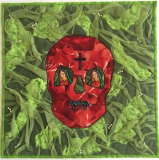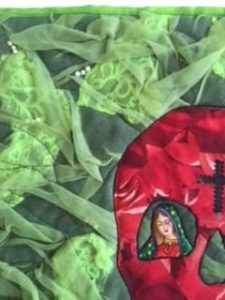 Once the background was how I wanted, I placed the skull appliqué and the images of Our Lady Of Guadalupe and fused them down. I covered the appliqué with black tulle and then couched the skull with a black thin cording with a zigzag stitch. I trimmed off the excess tulle and simply quilted it following the folds and pleats of the fabric. I embellished with some pearls, a ribbon cross on the forehead and for the mouth, a piece of a strap of my daughters old flip flops. The binding is made from a sheer lime green 1 inch ribbon from my recycled ribbon stash.