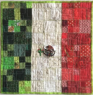 I wasn’t sure what I was going to do with the theme of squares. All I kept thinking was squares, squares, squares. With that in mind, I went to my scrap bin and started separating some colors. Once I had a couple of piles of colors, I noticed I had three main colors … green, cream and red. I really didn’t have a design yet. During this time, here in Mexico we were celebrating Mexican Independence. So thinking of the theme of squares and the celebration of Mexican Independence, I began cutting different size squares in these 3 colors, which turns out are the colors of the Mexican flag. With this in mind, I began sewing my green squares, then my red squares and as I was joining my cream squares I decided to add parts of a small Mexican flag I had.