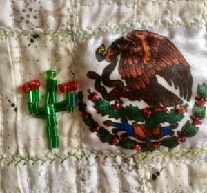 The centre of our flag is an eagle devouring a snake, perched on a prickly pear cactus. I decided that this would be my focal point. Once my top was sewn together I added a decorative stitch throughout most of the seams with a green variegated polyester thread. As I was preparing my sandwich for quilting, I decided that I wanted to eagle square to be raised or trapuntoed, so I added several layers of batting to that one square. Keeping in mind the theme of squares, I quilted it with free motion squares and used a transparent lime green polyester ribbon for binding. Knowing that I love texture, I decided to keep it simple and just added a beaded cactus and a few beads on the eagle.
