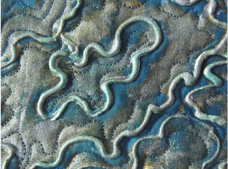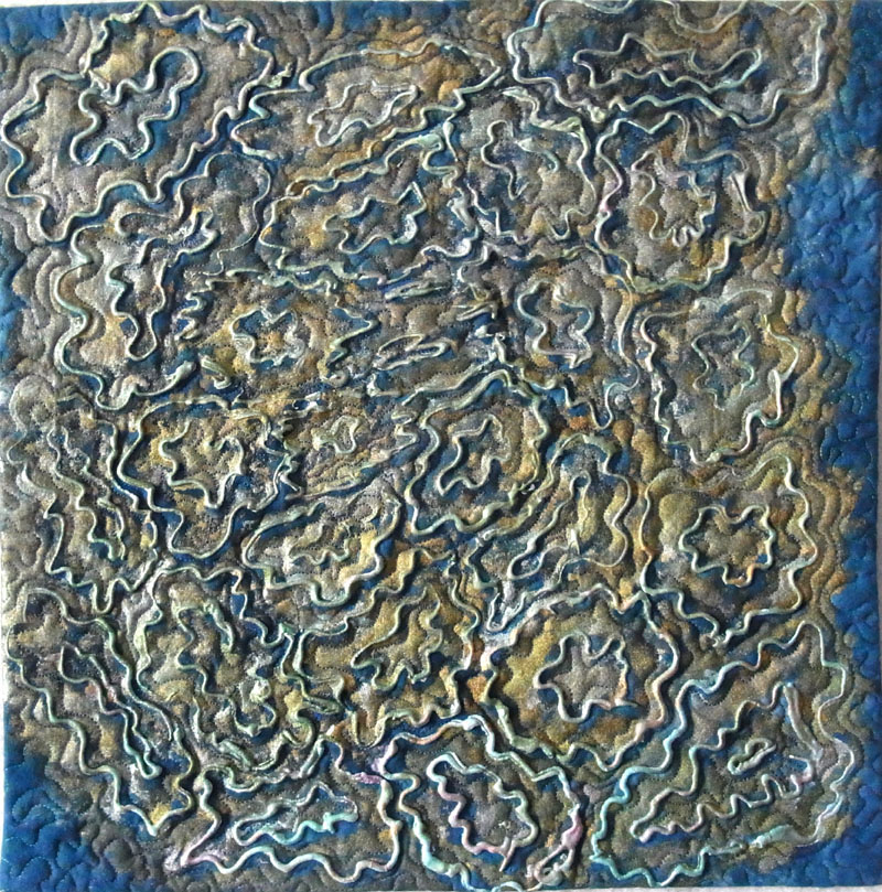 The inspiration for this quilt came from a photograph that I took of coral exposed at low tide. Because of the water it shimmered like a pale coloured rainbow. The background is hand dyed. The texture is created with expandable medium and then it was painted with Lumiere paints. Afterwards it was machine quilted to add more texture.