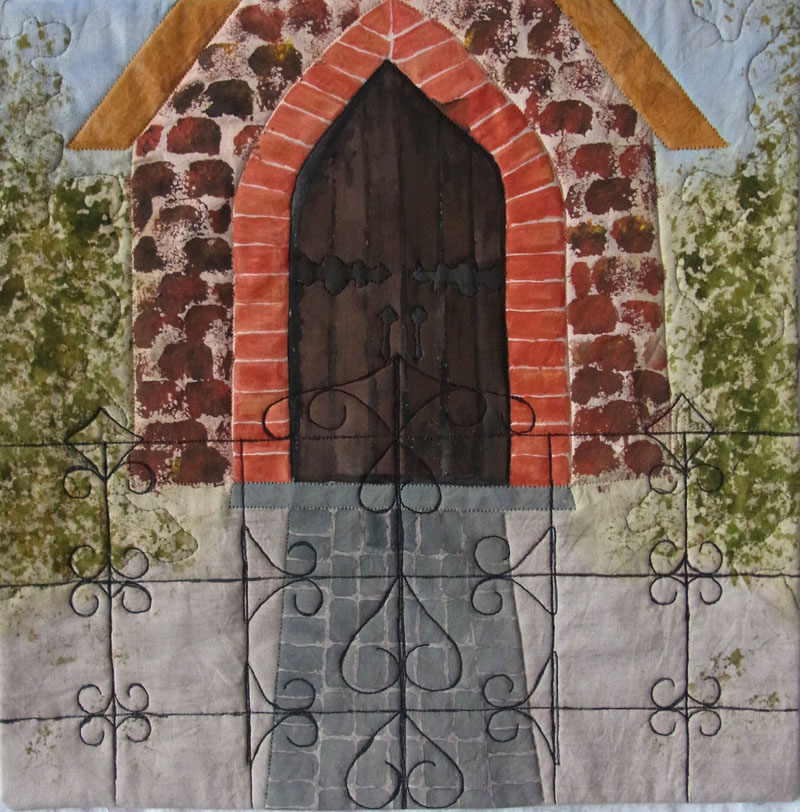 For many years I have taken pictures of all different types of entry. Doors, arches, arbours and gates, as I had the idea that one day I would do a series of quilts, but so far this hasn’t happened. So when Entrance was chosesn as the theme I had a vast amount of material from which to choose. I narrowed it down to two pictures, one of a lovely church door and the other a wrought iron fence and gates. I couldn’t decide which I wanted to use so in the end I used both of them. The background is painted and printed, the wrought iron stitched, I also used Inktense pencils and Pigma pen.