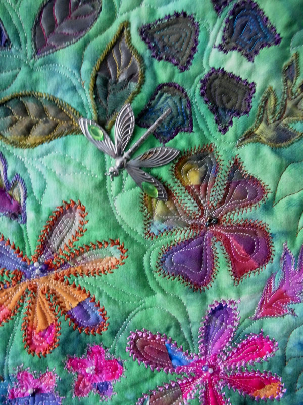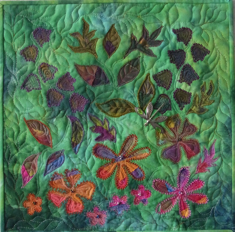 Hand dyed fabric and crystal organza, layered to form base. Hand dyed whole cloth top layer. Reverse applique cut away to reveal flowers and leaves. Hand and machine embroidery. Beading. Machine quilted. The dragonfly was given to me by my granddaughter, and I thought it apt to put on a nature quilt.