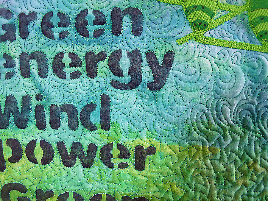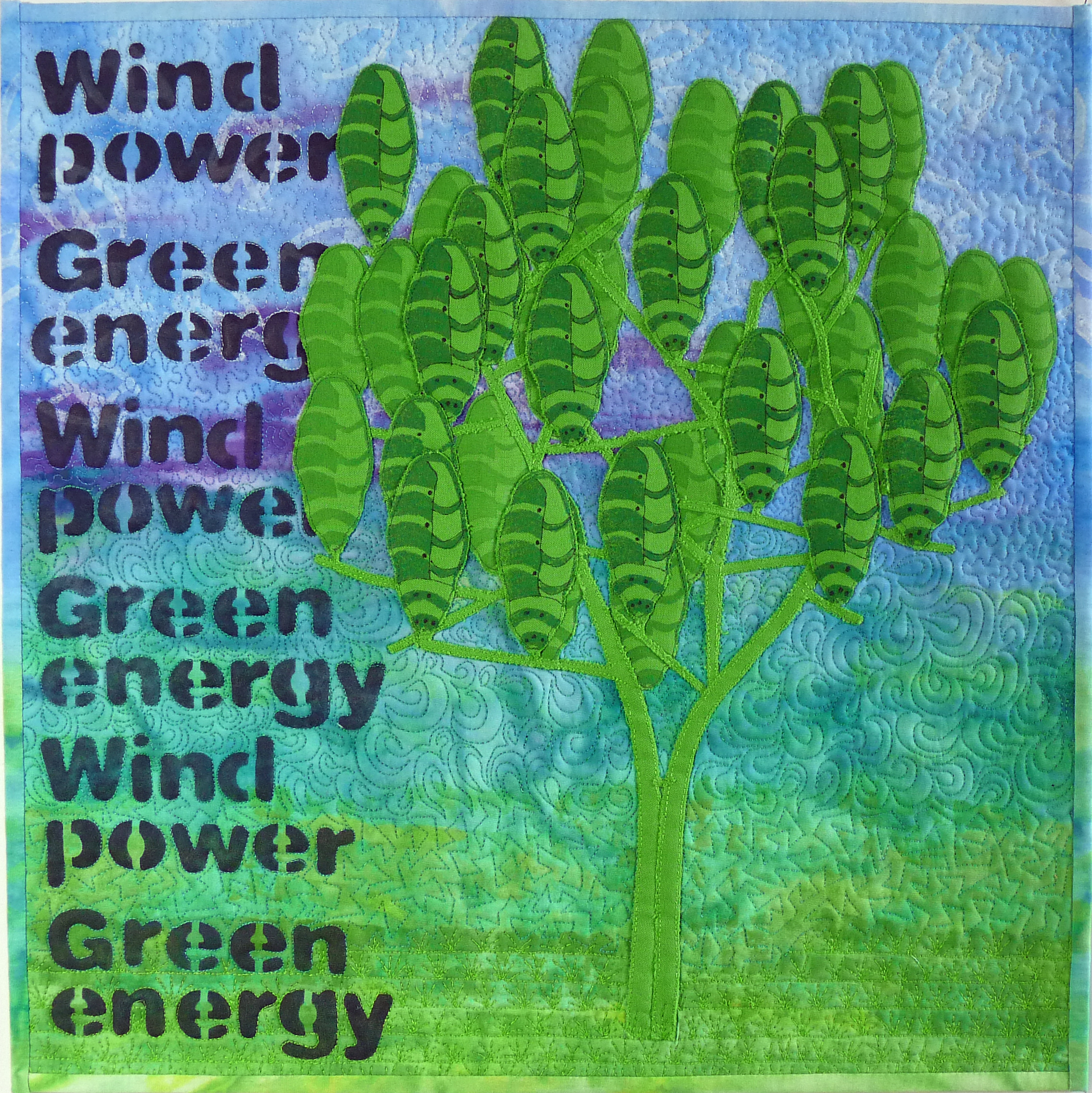 The background is a fabric painted wash overprinted for the “sky” area with wind turbine “clouds” fabric printed with hand-made stamps using the white turbine design. For the tree I found some commercial fabric in my scrap box that seemed to be approximately the right colour. The turbines were again printed using fabric paint and a home-made stamp onto this fabric, this time using the green turbine design. The original tree “trunk” and “branches” were white but I found the contrast too extreme so opted to use the same green fabric. The lettering was stencilled using markal paintsticks.