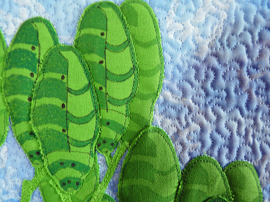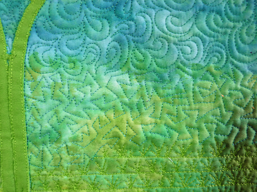 The tree has been fused onto the background in several layers and then free motion straight stitched to give some sense of depth. Various free-motion quilting designs have been stitched into the background and the tree has been defined by quilting around the turbines. A sharpie pen was used to define certain parts of the turbine. The quilt is bound using fabric painted fabric.