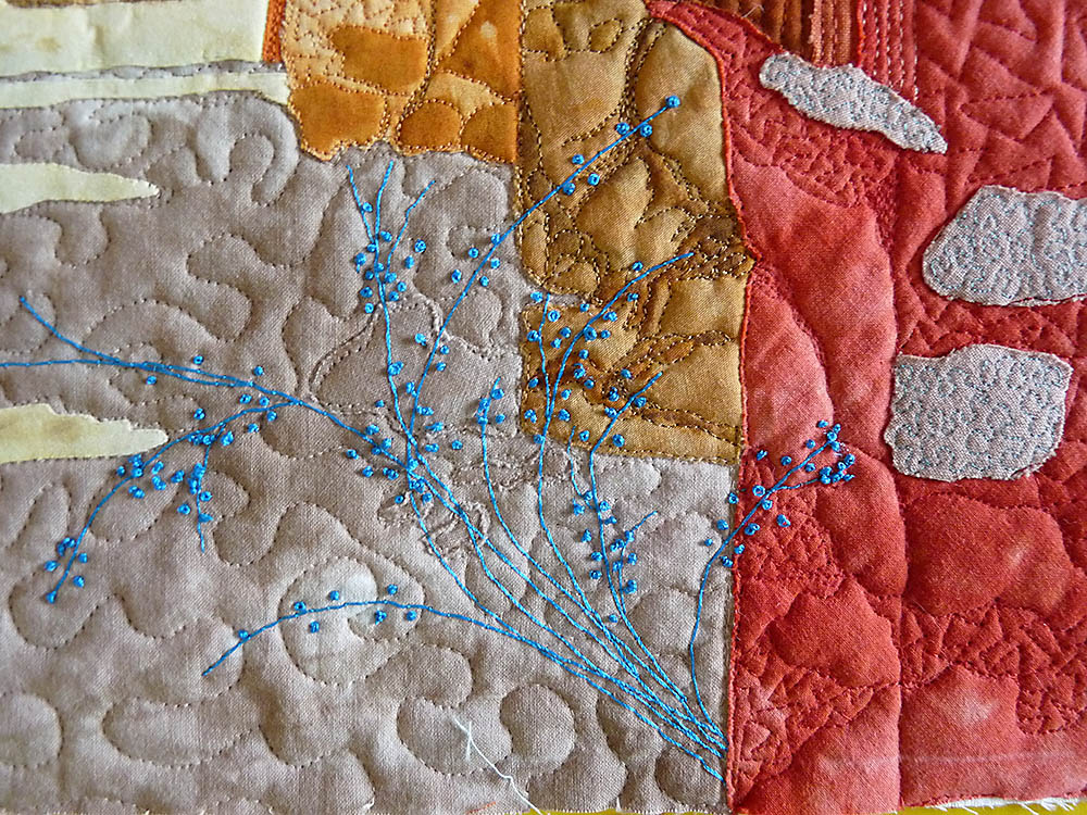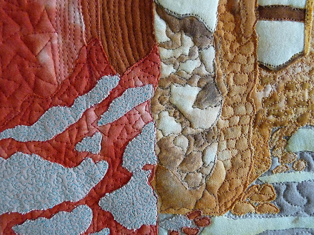 It was constructed by creating freezer paper templates which were then fused onto a background from the back to the foreground. Fabric paints were used for details and to enhance some of the texture in the hand dyes. A neutral organza was used to try and give the impression of the shafts of sunlight, except those in the foreground which are painted. I free motion stitched detail and backgrounds. The bush is hand – stitched with thread couched for the stems and French knots for the foliage.