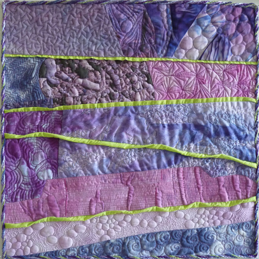 It has been made with a selection of fabric all hand produced. They are either Procion MX hand dyed, manipulated photos printed onto fabric, fabric painted or disperse dyed. A selection of techniques were used to create visual texture. The piecing included inserting piping (the zigzag road) but I removed the cotton piping cord when I realised I couldn’t quilt around it. I do rather like the slightly wavy line this has produced. I opted for a complementary colour scheme based around purple because I wanted to introduce a little colour but again push myself as these are not colours I generally fell happy with. I heavily free motion quilted a variety of designs reminiscent of what I see around Muscat. One section has been hand stitched in stab stitch.