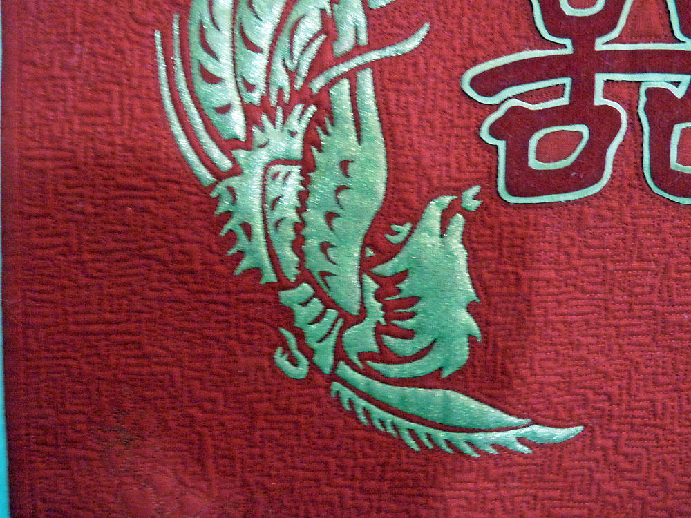 I found the theme of “happy” very difficult. I was thinking about the design for my niece’s wedding quilt and began wondering about weddings in the Far East as she was married in Thailand. Research found me the Chinese double happiness symbol. This is actually two words for happiness, hence double happiness. Whenever Chinese people see this symbol, they think of a wedding. They think of two persons getting married and also think of the two families sharing the happiness of the wedding. It is also not uncommon for a phoenix and a dragon to be linked to the double happiness word. The legendary phoenix rising from ashes to create a new life is the yin of the yang found in the dragon symbol. When you use the two together, you draw the energies of yin and yang in an effort to create the perfect balance, which in turn will bring great happiness. Red is the traditional colour used for a wedding invitation.