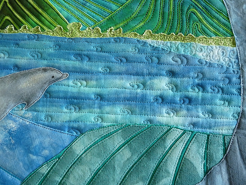 Gaye, I love the motion you’ve captured in this piece with your quilting — and the dolphins and tree are just the right touch of life. Your son, though, needs to get out (in nature) more! 😉